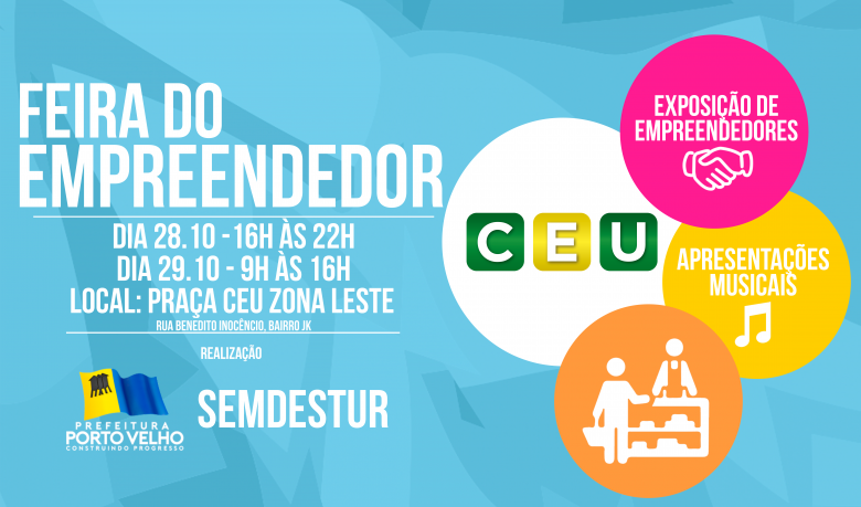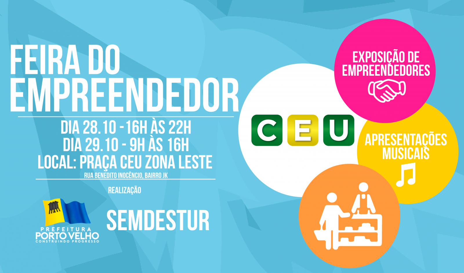 Incentivar o comércio de produtos regionais. É com essa finalidade que a prefeitura de Porto Velho, através da Subsecretaria Municipal de Indústria, Comércio, Turismo e Trabalho (Semdestur) realiza nos dias 28 e 29 de outubro a Feira do Empreendedor, que será realizada em frente a praça do Centro de Artes e Esportes Unificado (CEU), na zona Leste.
