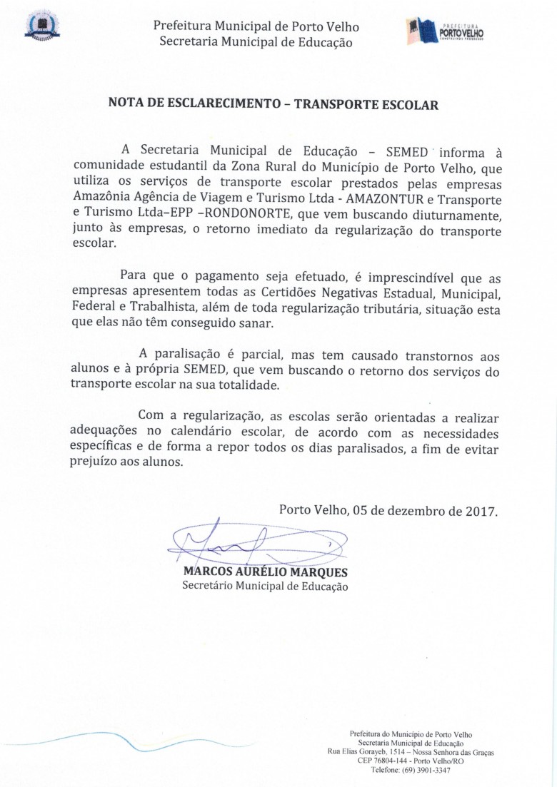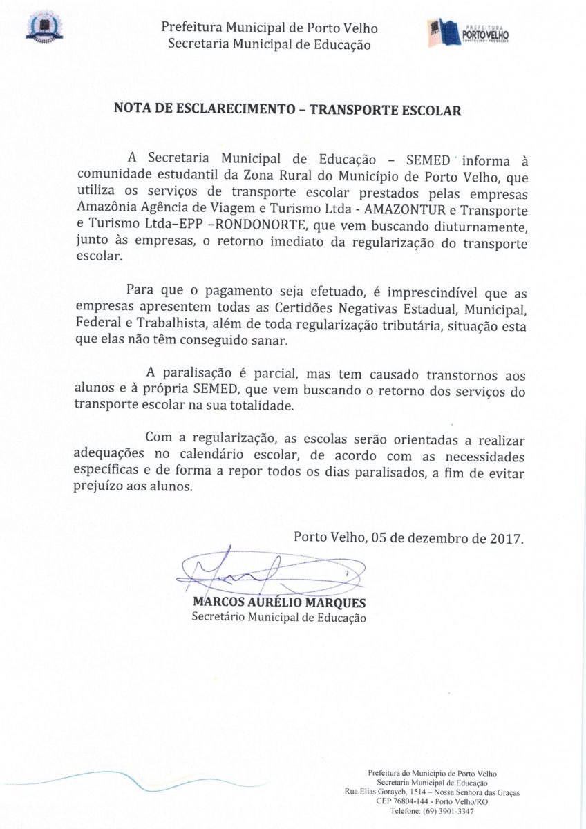 NOTA DE ESCLARECIMENTO - TRANSPORTE ESCOLAR