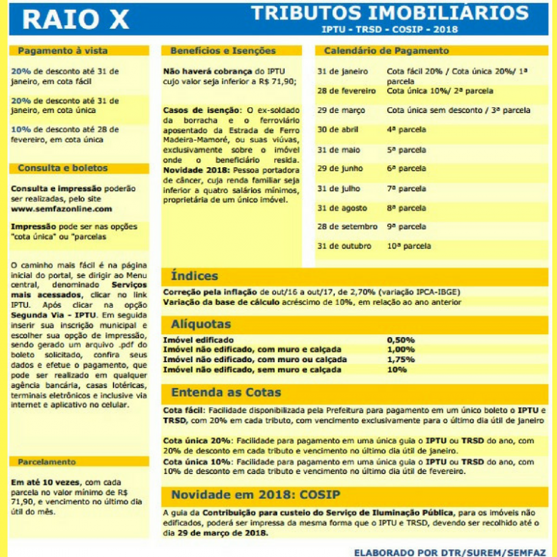O contribuinte porto-velhense tem até o dia 31 de janeiro para pagar com desconto de 20% o valor devido em IPTU, Taxa de Resíduos Sólidos e Cosip (iluminação pública) exercício 2018, na chamada cota fácil. A mesma redução se aplica, também, à quitação em cota única, no mesmo prazo.