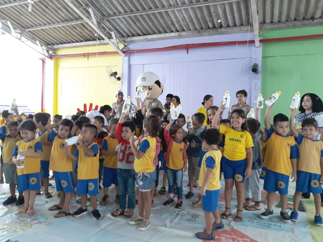 Crianças de 3 a 5 anos da Escola Municipal Semente do Araçá, à Rua Castro Alves, Bairro São Sebastião, na Zona Norte de Porto Velho, participaram de uma aula de educação para o trânsito nesta segunda-feira (3), realizada por agentes da Secretaria Municipal de Trânsito, Mobilidade e Transportes (Semtran).