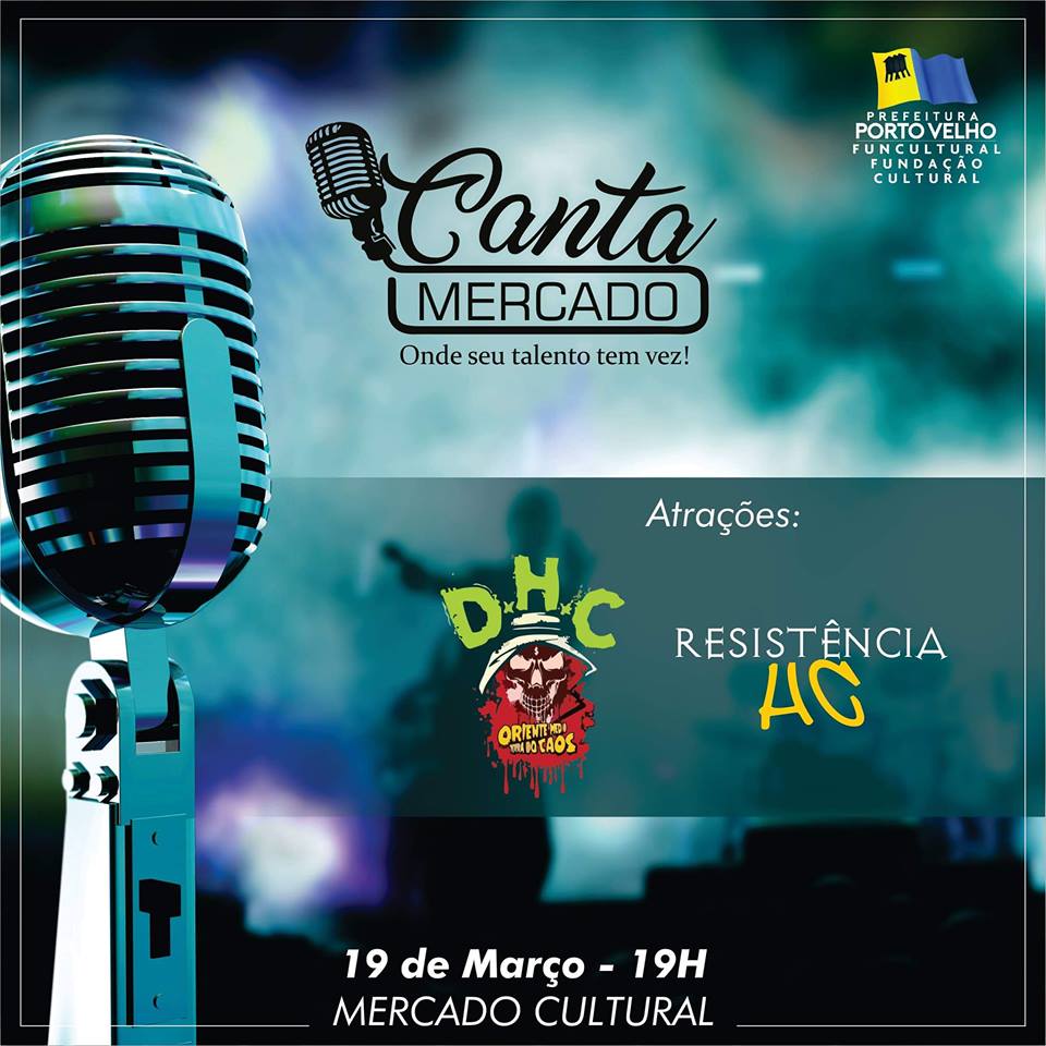 Após o período de recesso, o projeto "Canta Mercado" está de volta nesta terça-feira (19), a partir das 19 horas, no Mercado Cultural. O evento, realizado semanalmente, idealizado pela Prefeitura de Porto Velho ocorre sob a coordenação da Fundação Cultural de Porto (Funcultural). Para esta edição, as atrações confirmadas são as bandas DHC (Delinquentes da Humanidade em Caos) e Resistência HC.