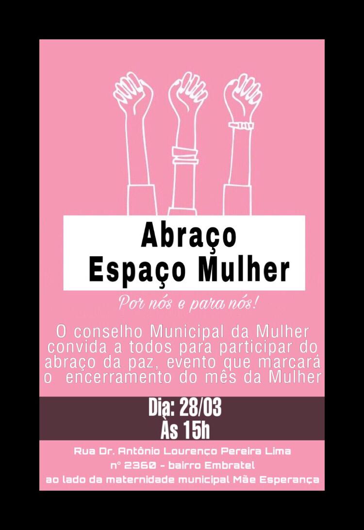 O Conselho Municipal de Defesa dos Direitos da Mulher (CMDDM) realizará, nesta quinta-feira (28/3), a partir das 15h, o evento ‘Abraço Espaço Mulher’, o abraço da paz, que marca o encerramento do ‘Mês da Mulher’. A atividade acontece no Espaço Mulher, à rua Dr. Antônio Lourenço Pereira Lima, 2360, no bairro Embratel, ao lado da maternidade municipal Mãe Esperança. O Conselho convidou a população de Porto Velho para participar do evento.
