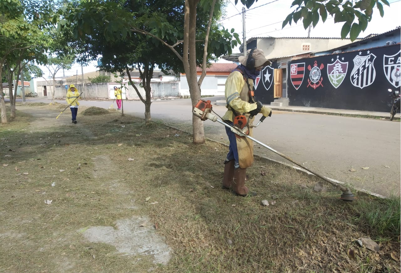 Equipes de 12 garis estão executando os serviços de roço, rastelagem, varrição das calçadas, limpeza de meio-fio e recolhimento de materiais inservíveis.