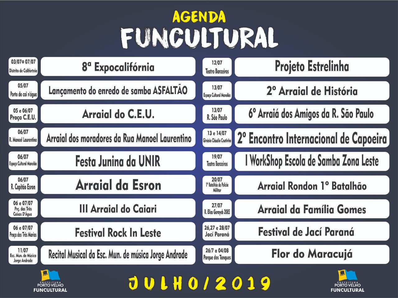 Segundo o presidente da Funcultural, Ocampo Fernandes, o mês de julho está repleto de atividades que recebem o apoio logístico e estrutural da Fundação, como palco, som e iluminação. Alguns dos eventos que terão apoio do Município é o Arraial Flor do Maracujá e o Festival de Praia de Jaci-Paraná.