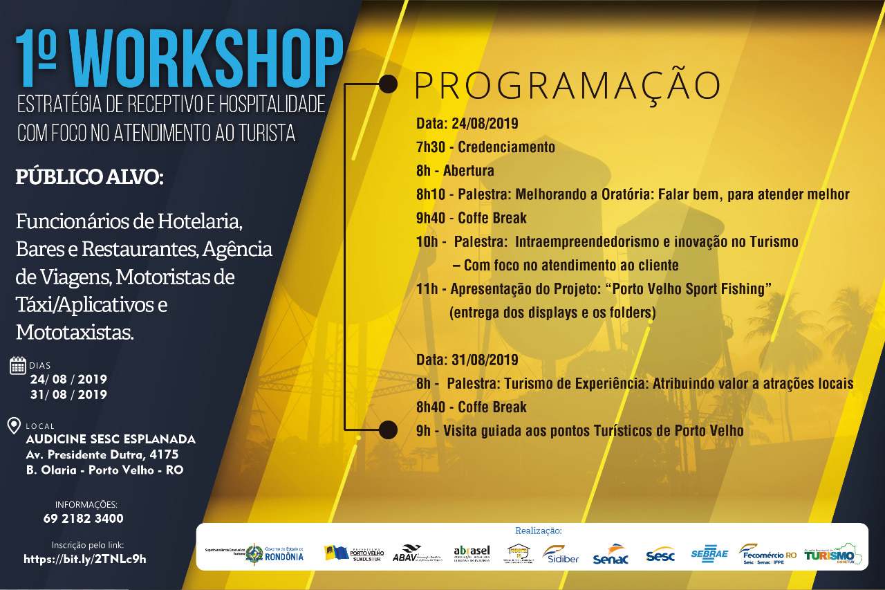 A Prefeitura de Porto Velho, por meio da Semdestur e em parceria com a Federação do Comércio e Superintendência Estadual de Turismo, promoverá nos dias 24 e 31 de agosto o workshop: “Estratégia de receptivo e hospitalidade com foco no atendimento ao turista”. A iniciativa é voltada especificamente para alguns segmentos da cadeia produtiva do turismo, tais como funcionários de hotelaria, bares e restaurantes, agência de viagens, motoristas de aplicativos, táxi e mototaxistas.