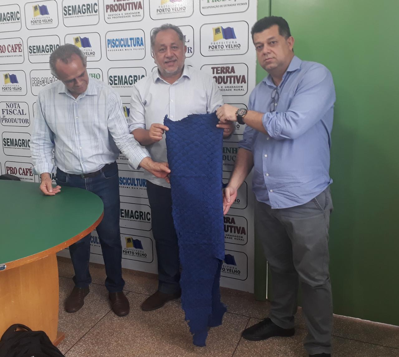 “Hoje todo o couro de pirarucu de Rondônia é adquirido pela empresa Nova Kaeru, com sede no Rio de Janeiro”, disse o titular da Semagric, Luiz Cláudio da Agricultura, que esteve reunido com Leal Marques, gerente de negócios da empresa e que veio manifestar interesse numa parceria que valorize o produtor de peixe de Rondônia.