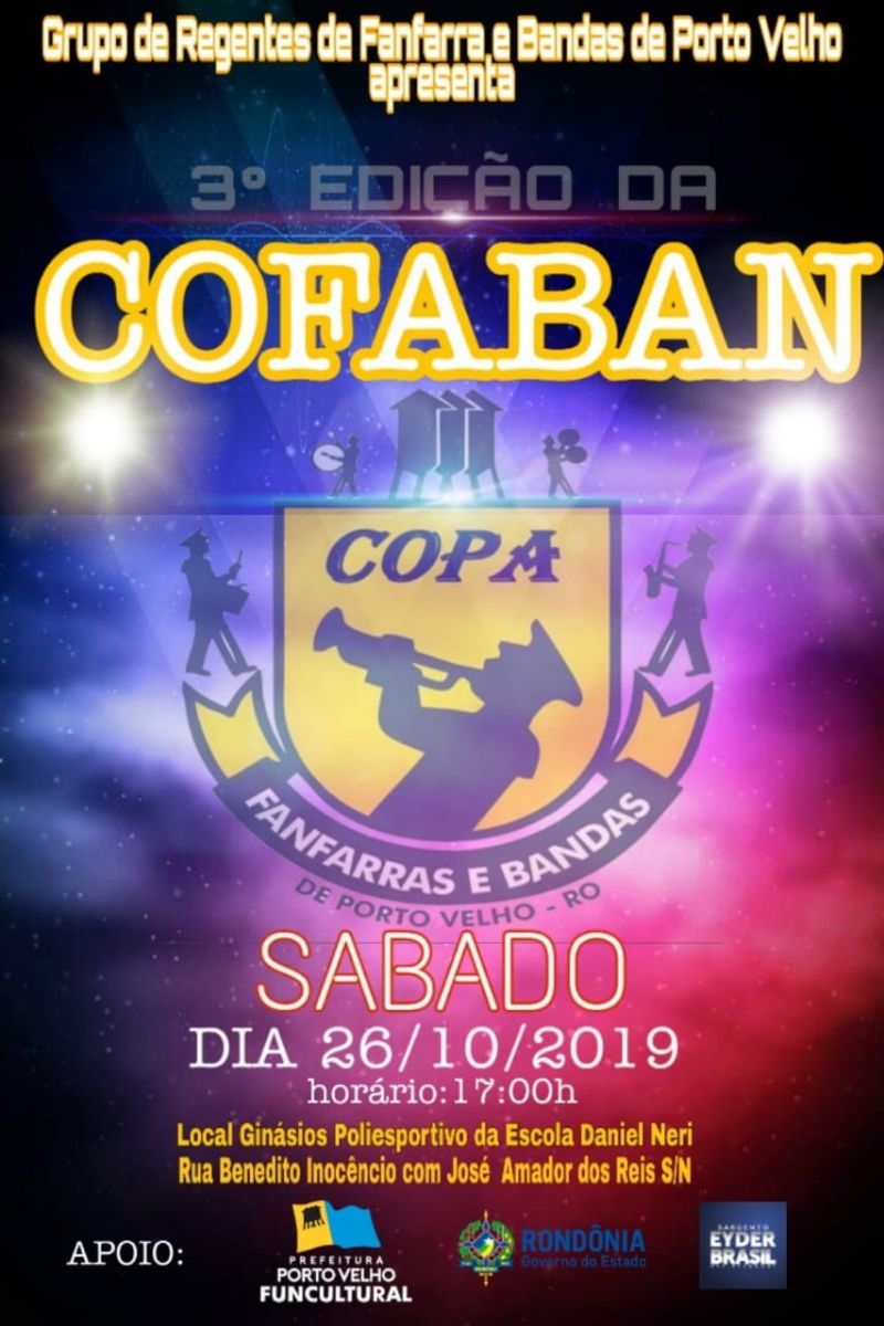 A Prefeitura, por meio da Fundação Cultural do Município (Funcultural), está apoiando a 3° Edição da Copa de Fanfarras e Bandas (Cofaban), realizada pelo Grupo de Regentes de Fanfarras e Bandas de Porto Velho. O evento acontece no próximo dia 26, a partir das 17h, na quadra poliesportiva da Escola Estadual de Ensino Fundamental e Médio Professor Daniel Neri da Silva, no bairro JK.