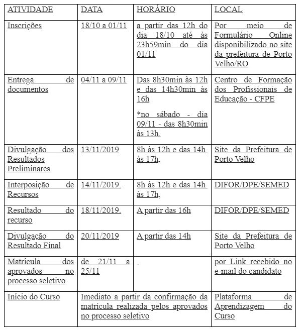 O cronograma de atividades do presente processo seletivo seguirá o disposto: