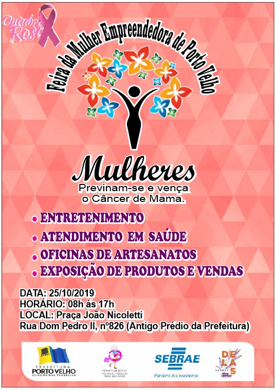 A Prefeitura de Porto Velho, por meio do Departamento de Políticas Públicas para Mulheres, coordenado pela diretora Gina de Brito, com patrocínio do Sebrae, realiza nesta sexta-feira (25), a Feira da Mulher Empreendedora das 8h às 17h, no Palácio Tancredo Neves, antiga sede da prefeitura, à rua Dom Pedro II, nº 826.
