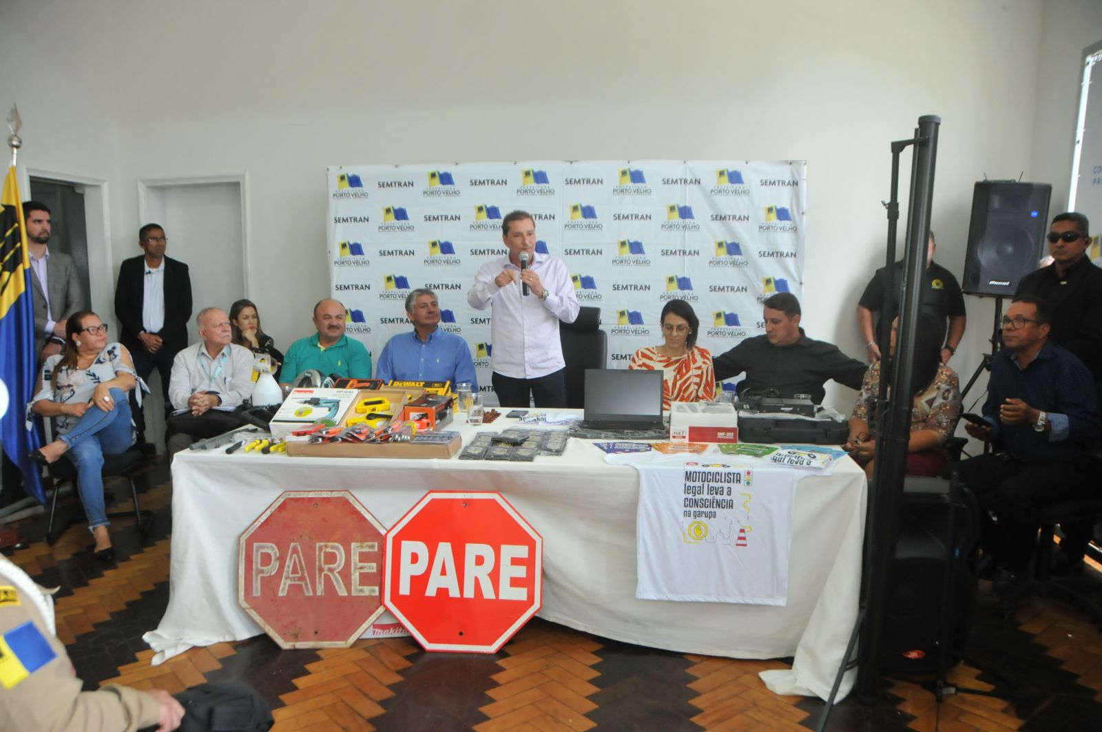 O prefeito Hildon Chaves fez a entrega pra a Secretaria Municipal de Trânsito, Mobilidade e Transportes (Semtran) de equipamentos para as ações de educação no trânsito e sinalização, nesta sexta-feira (1), no auditório do Prédio do Relógio (sede do poder executivo).