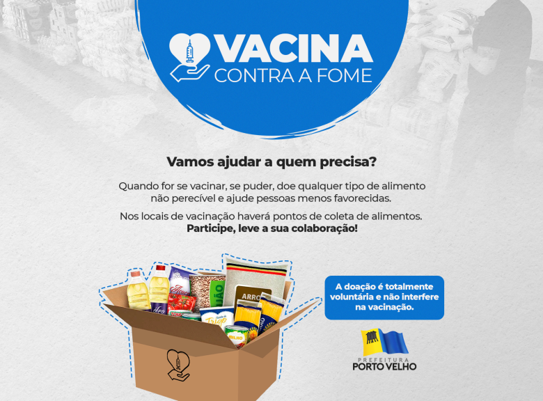 A pandemia de Covid-19 tem provocado uma crise econômica em várias vertentes e, com isso, famílias têm estado em constante situação de vulnerabilidade social. Para tentar mitigar estes efeitos, a Prefeitura de Porto Velho lança, nesta semana, a campanha “Vacina Contra a Fome”. A ideia é sensibilizar a população quanto à doação de alimentos não perecíveis a quem mais precisa neste momento crítico ajudando na ação de combate à fome.