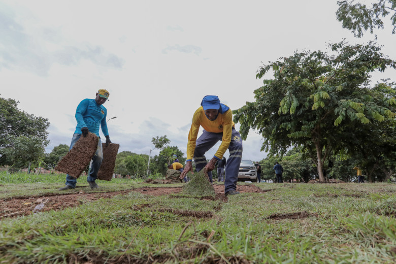 Neste primeiro momento, estão sendo implantados 4 mil metros quadrados de grama, serviço que faz parte da recuperação da Área de Preservação Ambiental (APA) do Parque Jardim das Mangueiras. Ao todo, serão instalados 7.500 metros quadrados de grama, além do plantio de espécies nativas que vão contribuir para a recomposição vegetal.