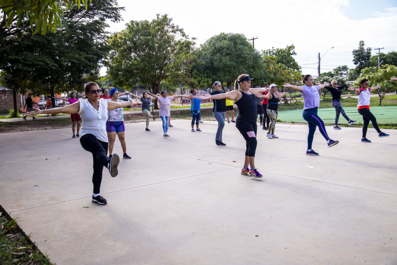 A autônoma é uma entre mais de 30 participantes das aulas de ginástica que acontecem as segundas e quartas no Parque Jardim das Mangueiras, conhecido como Skate Parque, a partir das 8h. As atividades são orientadas por profissionais da área de Educação Física da Semes.