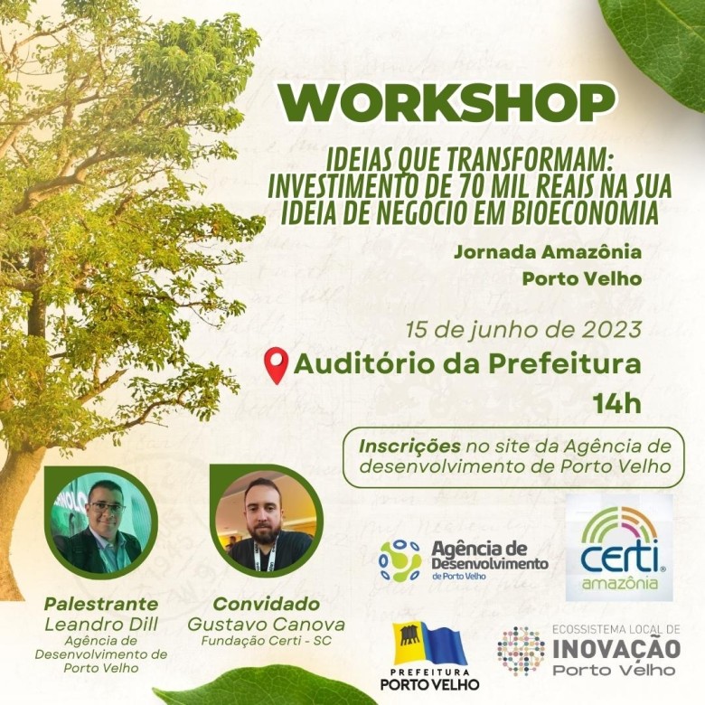 Realizado pela Prefeitura, através da Agência de Desenvolvimento de Porto Velho (ADPVH), e em parceria com a Fundação Certi Amazônia, o evento estará aberto para todas as pessoas que tiverem uma ideia inovadora de desenvolvimento relacionada à Bioeconomia no município.