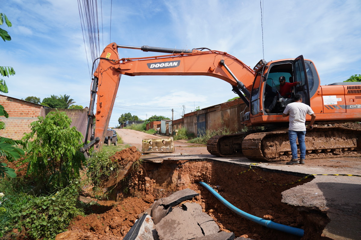 Segundo técnicos responsáveis pela obra, as manilhas que estavam instaladas no local já não comportavam o volume de água gerado pelas chuvas intensas que atingiram a região do bairro Cidade Nova. O excesso de fluxo acabou saturando a rede pluvial, contribuindo para a erosão que levou ao rompimento do pavimento.