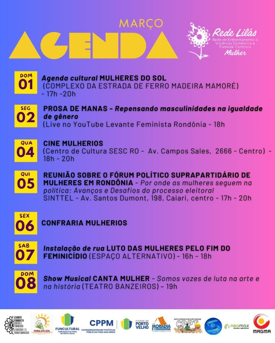 Com apoio da Prefeitura de Porto Velho, por meio da Coordenadoria de Políticas Públicas para Mulheres, e de parceiros culturais e comunitários, o evento "Mulheres do Sol" é promovido pelo Ponto de Cultura Feira do Sol e pelo Fórum Popular de Mulheres, marcando a abertura do mês de março com um encontro que celebra arte, artesanato, moda e as múltiplas experiências das mulheres na sociedade.
