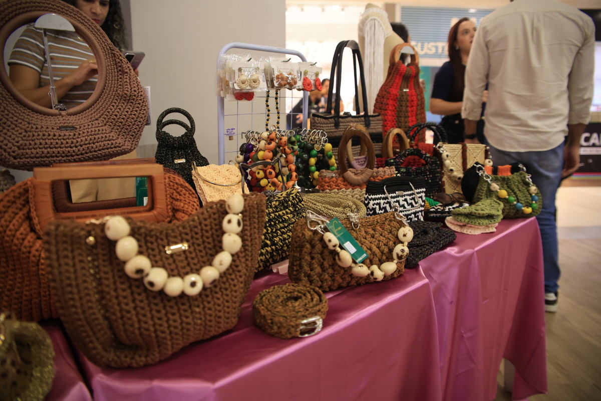Glória Verçosa leva para a feira peças que valorizam a identidade amazônica“Eu trabalho com bolsas exclusivas e um dos diferenciais da minha marca é a sustentabilidade. Uso sementes de jarina nos acessórios e nas alças. Quando uma peça dessas é descartada, ela não causa o mesmo impacto que materiais sintéticos ou plásticos. Também procuro trazer elementos da nossa Amazônia, como a bolsa inspirada no peixe Tambaqui, que foi um dos meus lançamentos”, explicou a artesã.